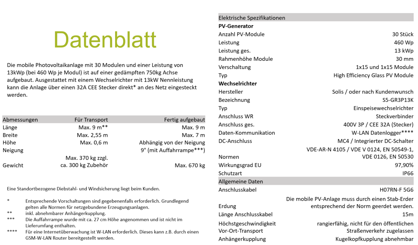 Entdecken Sie unsere mobile Photovoltaikanlage mit 13 kWp Leistung, 30 Modulen und 13 kW Wechselrichter. Ideal als flexible Alternative zu Dach- und Freiflächenanlagen. Leicht zu transportieren und schnell einsatzbereit!